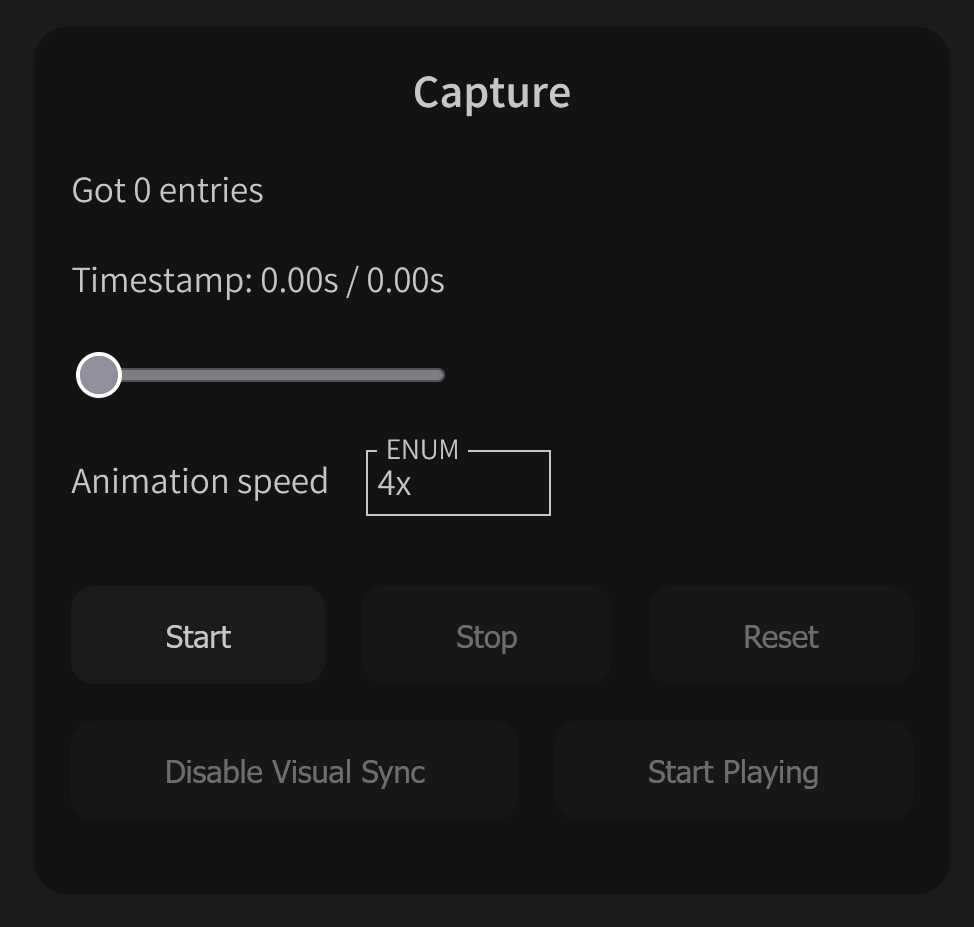 Start: Begins capturing data points and telemetry information during the match.Stop: Stops the data capturing process. This button should be clicked once the desired events have been recorded.Reset: Clears all previously captured data, resetting the capture session for a new recording.Enable Visual Sync: Synchronizes the visual field display and the telemetry data, ensuring that the replay accurately reflects the robot's movements and interactions.Disable Visual Sync: Disables the synchronization between the visual field and telemetry data. Returns to viewing realtime data.Start Playing: Initiates the playback of the recorded data, allowing users to review and analyze the match.Stop Playing: Pauses the playback at any point, enabling detailed inspection of specific moments within the recorded data.Animation Speed Control: Adjusts the playback speed of the recorded match. Useful for slowing down fast-paced actions or speeding through less critical phases.